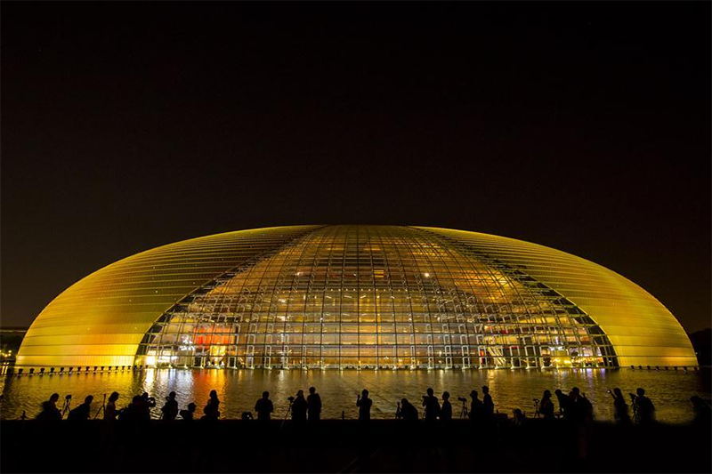 華燈初上,姹紫嫣紅。5月11日19時30分,隨著北京市夜景照明按照重大節(jié)日等級準(zhǔn)時開啟,北京的夜空被數(shù)以百萬計的五彩斑斕的夜燈點(diǎn)亮。國家大劇院外,近2300平方米的草地上布滿各種小噴泉造型的光纖燈管,北門臺階的10860套蘆葦燈配合著大劇院弧形外形和四周噴泉,輪番展現(xiàn)七色光譜,如夢如幻。