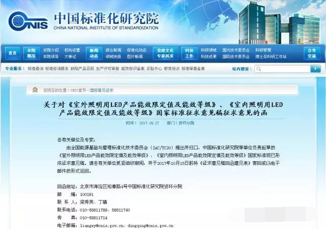 ?? 9月27日,中國(guó)標(biāo)準(zhǔn)化研究院在其網(wǎng)站上發(fā)布《關(guān)于對(duì)《室外照明用LED產(chǎn)品能效限定值及能效等級(jí)》、《室內(nèi)照明用LED產(chǎn)品能效限定值及能效等級(jí)》國(guó)家標(biāo)準(zhǔn)征求意見(jiàn)稿征求意見(jiàn)的函》,請(qǐng)各有關(guān)單位抓緊組織審閱,并于2017年10月15日前將《征求意見(jiàn)稿回函意見(jiàn)表》寄回或以電子郵件的形式返回。