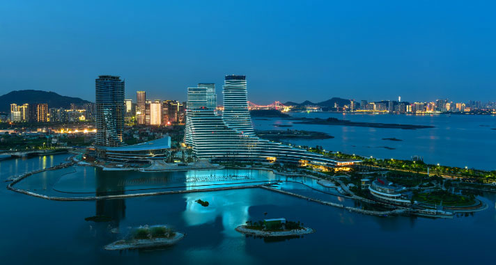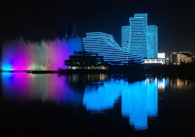 整個海滄灣沿線夜景工程以廈門中心、泰地海西中心、融信海上城三座大型城市綜合體為主要媒體展示節點,沿岸辦公住宅樓立面動態燈具相呼應,表達“山水相依”的動畫主題,形成7公里長海滄灣沿海景觀帶連綿不絕、氣勢磅礴,山、海、湖、島、城渾然一體的海滄夜景感受。建筑山墻的彩色投光通過海滄大橋動態聯動將海滄區與廈門本島緊密聯系在一起。